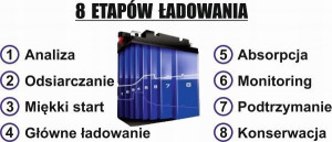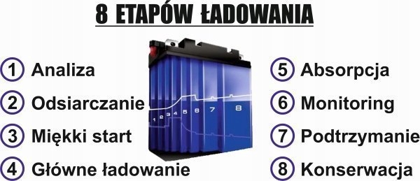 Wieloetapowy proces ładowania dla większej precyzji, bezpieczeństwa i żywotności akumulatora. Ładowarka posiada cyfrową diagnostykę "miękki start" oraz tryb podtrzymania naładowanego akumulatora.