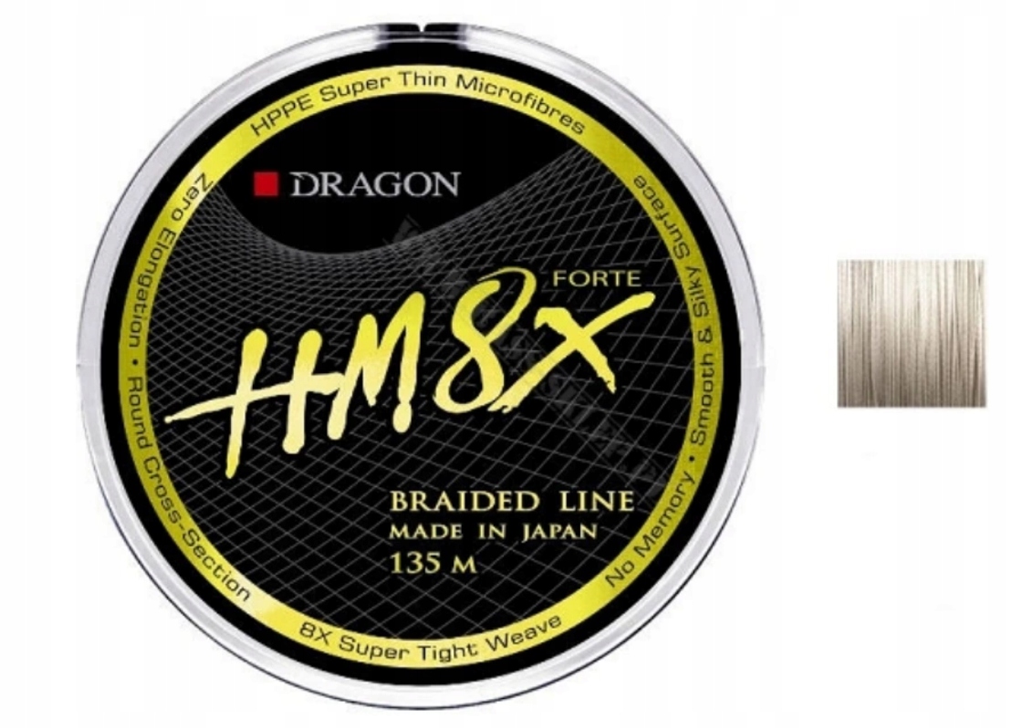 Najnowsza ośmiosplotowa plecionka HM8X Forte, wyprodukowana przez firmę Toray, to druga już generacja znakomitej linki HPPE Super Thin Microfibres. Jest to specjalna kompozycja włókna HPPE z dodatkiem amilanu (włókna aramidowego opatentowanego przez firmę Toray), splecionego w technologii ośmiosplotowej. W porównaniu do swojej poprzedniczki, plecionki HM8X, nowa HM8X Forte jest jeszcze wytrzymalsza i znacznie odporniejsza na niekorzystne czynniki zewnętrzne, co w znaczący sposób będzie opóźniać proces starzenia i pozwoli na dłuższy okres bezproblemowego użytkowania. Plecionka HM8X jest bardzo odporna na ścieranie i całkowicie pozbawiona rozciągliwości, a wytrzymałość na prawidłowo zawiązanych węzłach jest niemal identyczna z wytrzymałością liniową. Nowa linka jest doskonale okrągła w przekroju, miękka i jedwabista w dotyku, dzięki czemu możemy wykonywać dalsze i bardziej precyzyjne rzuty przynętą. Specjalne wykończenie powierzchni zapobiega plątaniu się linki nawet przy rzutach pod wiatr. Najnowsza HM8X Forte dostępna będzie w dwóch kolorach,szarym i pomarańczowym fluo, w odcinkach po 135 metrów. Firma Dragon jako pierwsza otrzymała prawo do dystrybucji nowej plecionki na terenie Europy.