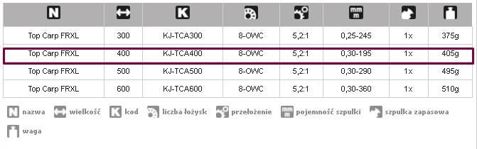 Najlepsza serii kołowrotków TOP CARP z wolnym biegiem z regulacją nacisku na szpulę obejmuje wzbogaconą, luksusową FRXL. Jest znakomitym narzędziem dla początkujących karpiarzy, mających doświadczenie z innymi metodami wędkarstwa, chcących spróbować połowów na ten gatunek ryb. Wersja FRXL to dodatkowo wzmocniona konstrukcja z 8 łożyskami – w tym łożyskiem oporowym OWC, szpulką główną z duraluminium i zapasową szpulką z tworzywa.
